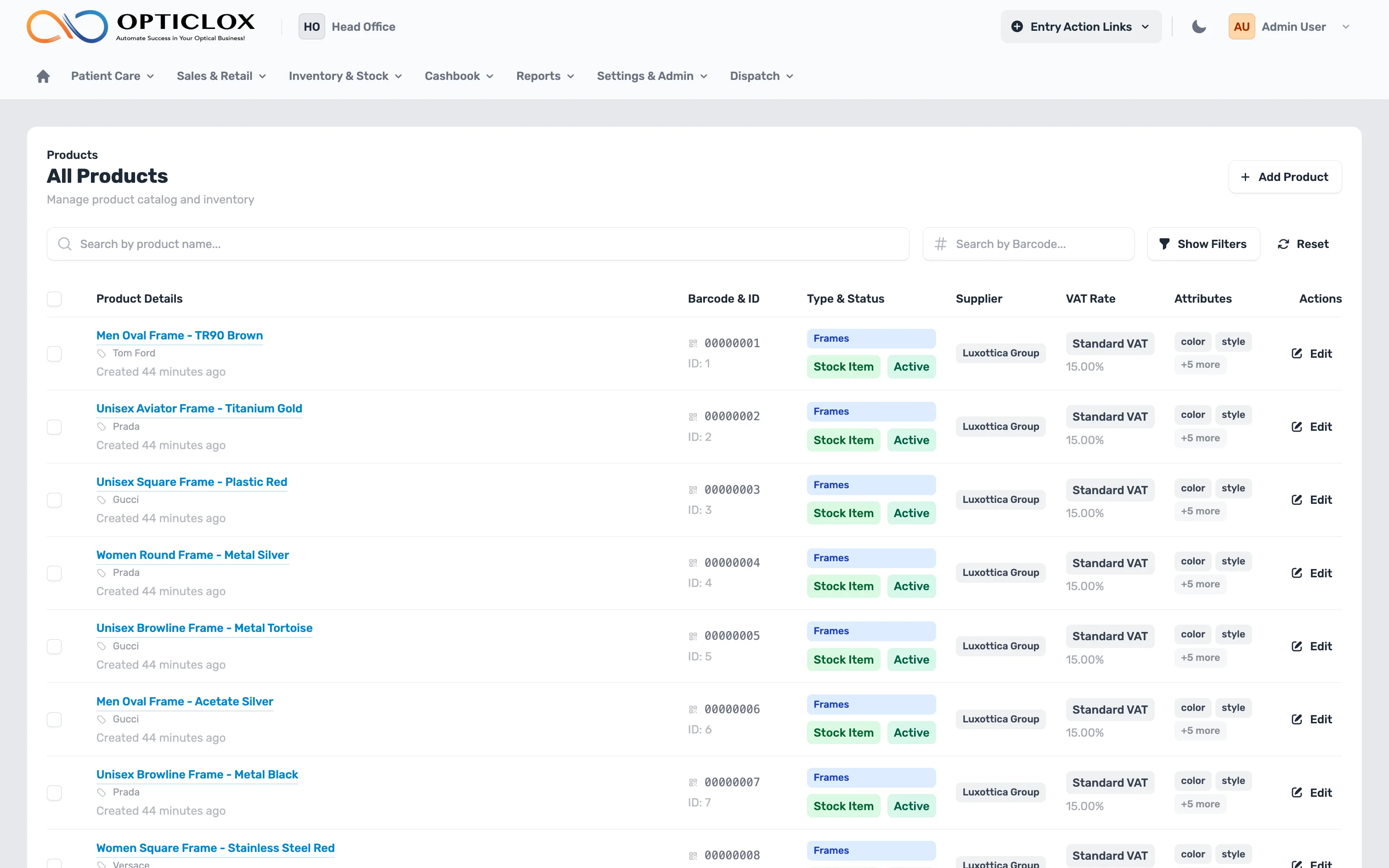 Create, organize, and track frames, lenses, and accessories. Manage pricing, suppliers, barcodes, and product details all in one place.